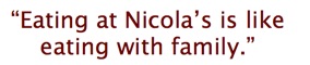 Nicola’s Italian Kitchen is an authentic Italian restaurant and real-life American Dream. Nicola and Tina De Fazio were both born in Italy where they lived until they immigrated to the U.S. in the 1960s. Both from traditional Italian homes, they met, fell in love, married and decided to share their traditions of hospitality and family gatherings with their friends. Of course, when their family gets together there are many homemade dishes of rich sauces, fresh ingredients and an atmosphere of warmth and welcomeness. The original Italian Kitchen was founded on this principal in New Britain, CT in 1965 and eventually was reborn as Nicola’s Italian Kitchen in Englewood, FL in 1990. The traditions haven’t changed at Nicola’s where the food is made from scratch just the way it was at the family gatherings in our home so many years ago. We invite you to share in our tradition and we welcome you to Nicola’s. From our family to yours, benvenuto.